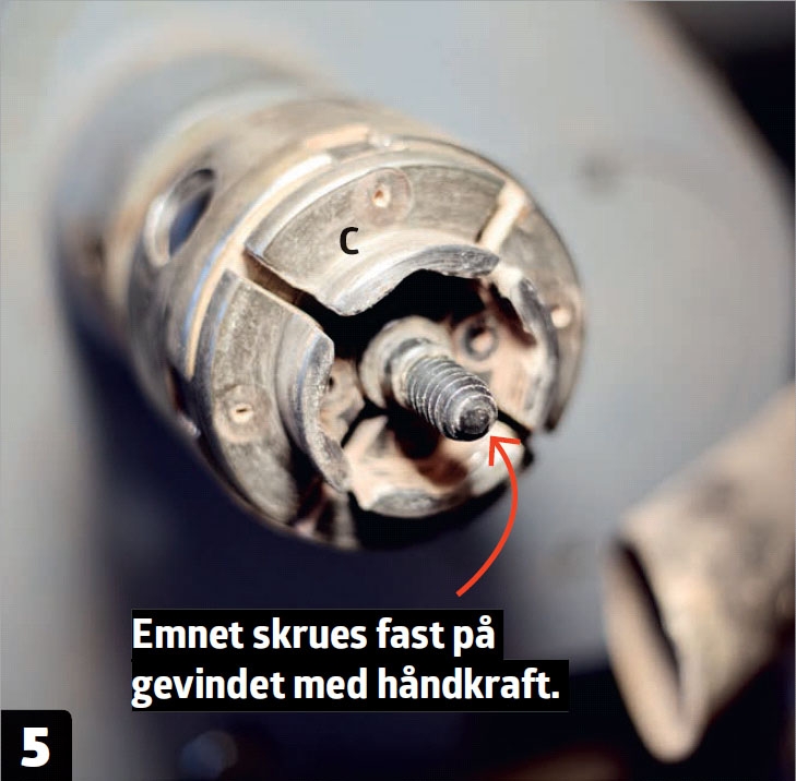 Bor et hul i emnet, så det efterfølgende kan skrues manuelt fast på motorens gevindstang. Det er vigtigt, at hullet er så lodret som muligt, så emnet ikke kommer “ud af balance”, når det roterer i høj hastighed.