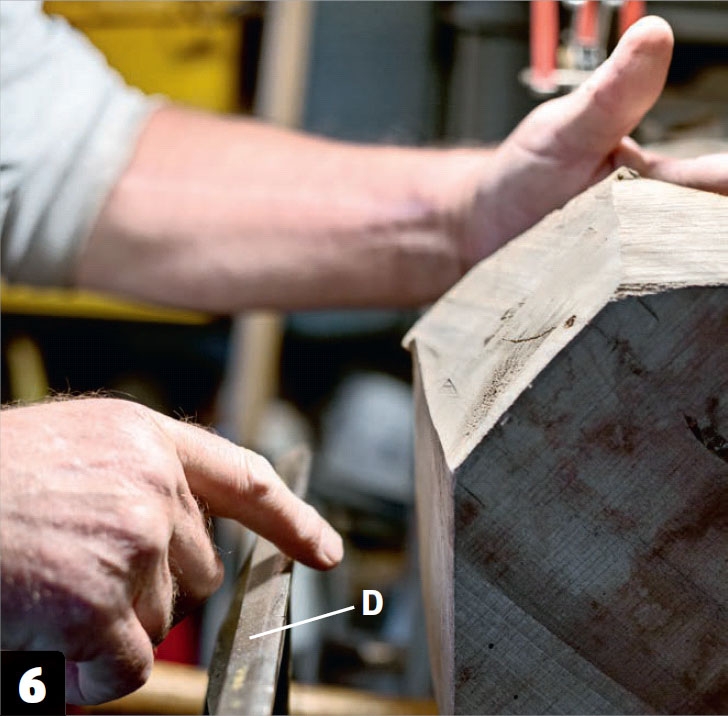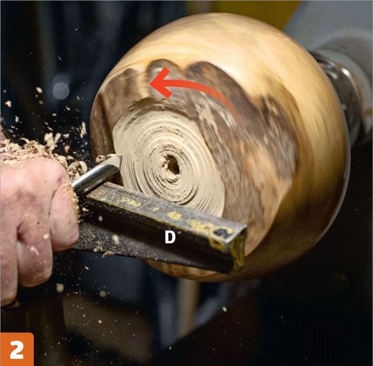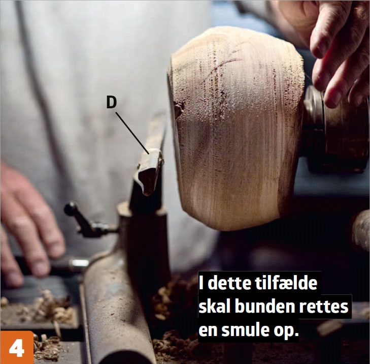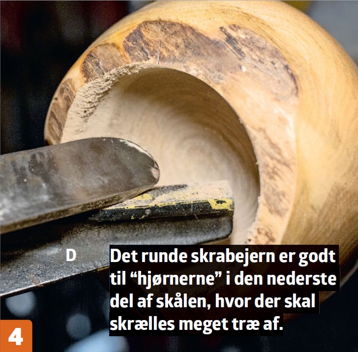 Skift til et rundt skrabejern, og ryk landet (D) ind i selve skålen, så jernets afstand til træet bliver så kort som muligt. Drejningen bliver meget nemmere, når drejejernet hviler solidt på landet.