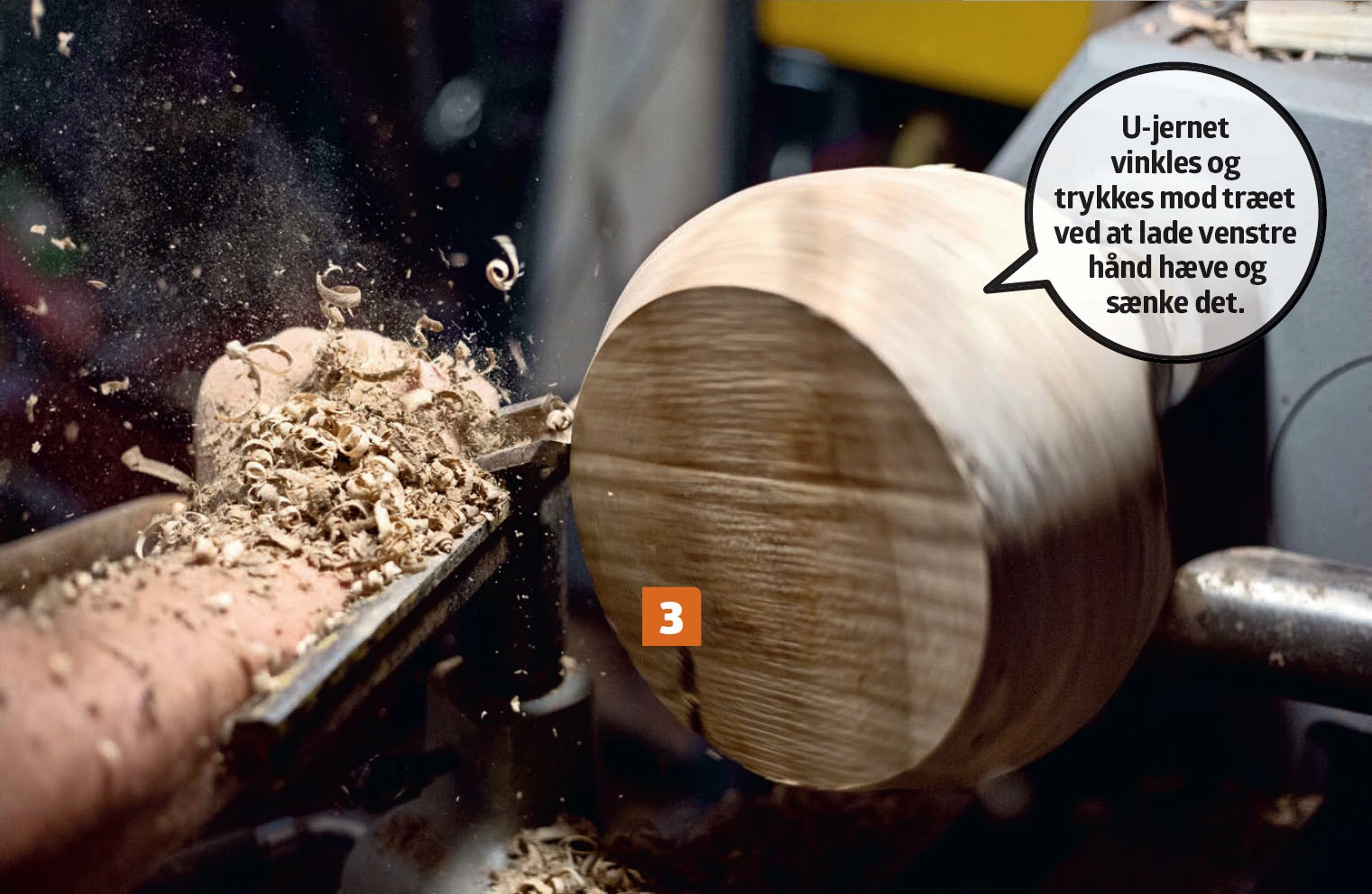 Indstil motoren på 400-500 o/min., og drej alle kanterne af med et U-jern, så emnet får en nogenlunde rund facon. Denne form for grovdrejning kaldes også “at skrubbe”.