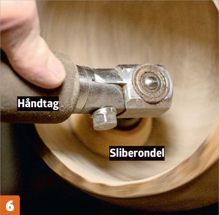 Tag et langt, smalt stykke slibepapir, og indstil hastigheden til ca. 700 o/min. Vi starter med korn 120 og skifter senere til 220 og 400 for at få en helt glat overflade. Undgå at trykke slibepapiret mod skålen, da det kan give dybe ridser.