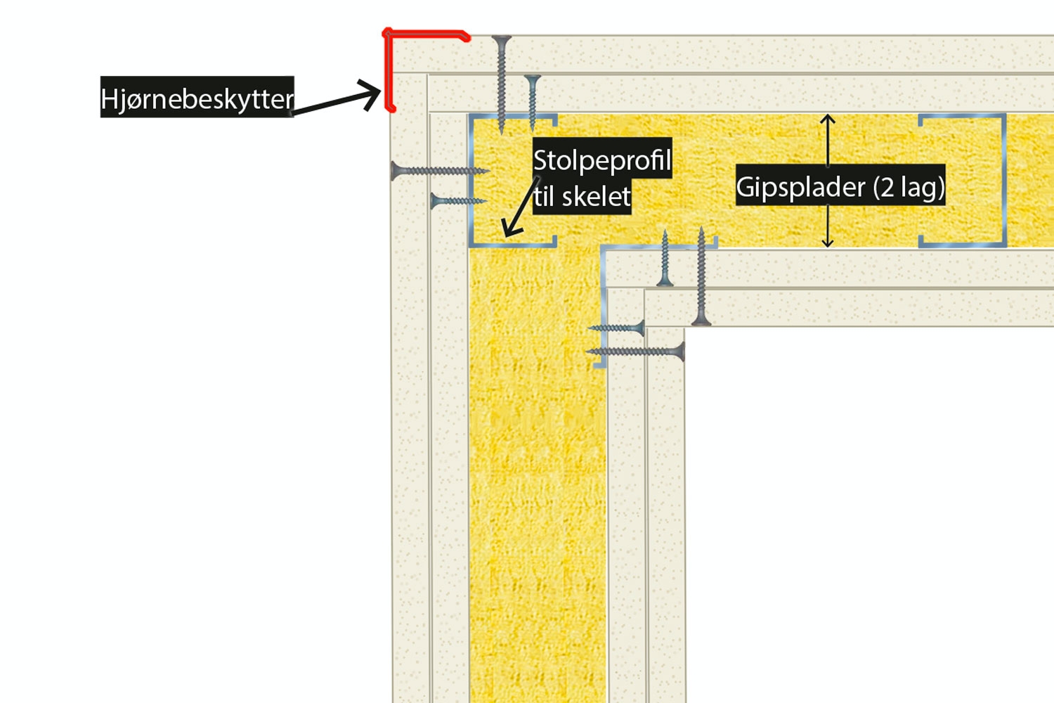 Det 2. lag gips fuldskrues, dvs. med en skrue for hver 20 cm hele vejen ned på begge sider. Sørg gerne for et par mm luft, så der bliver plads til hjørnebeskytteren.