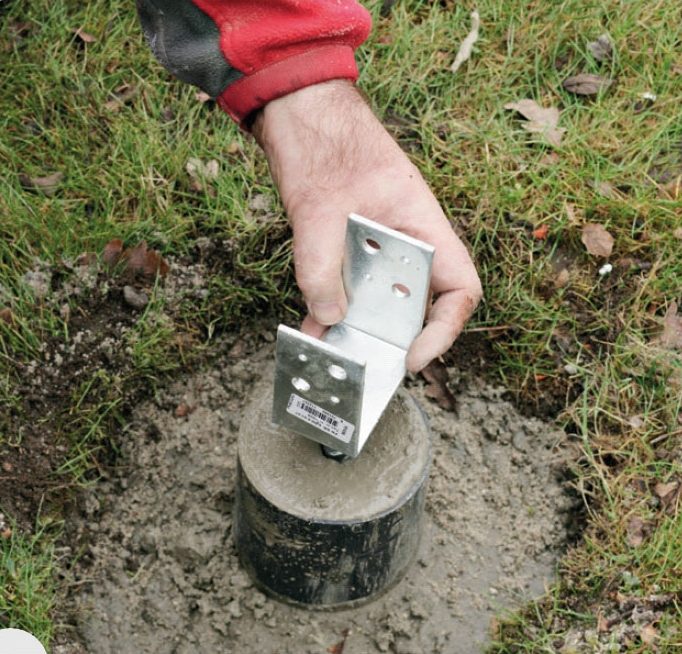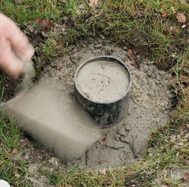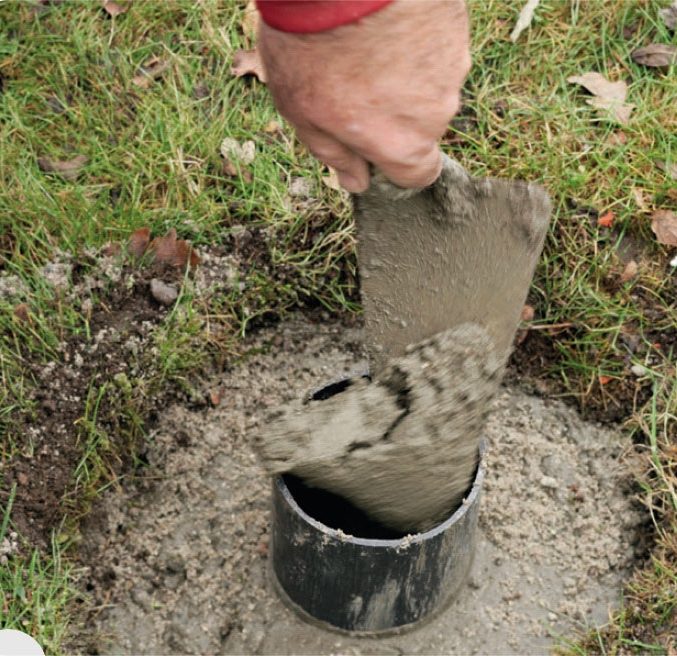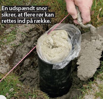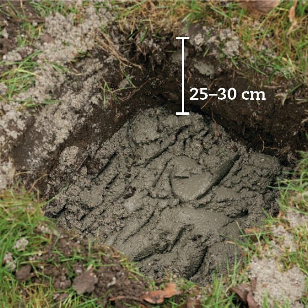 Grav ned til frostfri dybde, og fyld hullet med beton til ca. 25-30 cm fra jordplan. Beton blandes med 1 del cement, 3 dele grus og gerne 3-4 dele småsten.