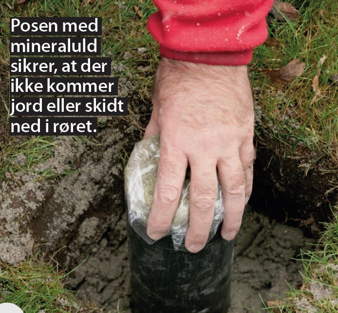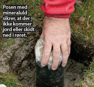 Sæt røret lidt ned i den våde beton. Røret er tilpasset, så dets overkant er lig med, eller lige over, jordplan. Stop røret ud med et tilfældigt fyldmateriale, her en pose med lidt mineraluld.