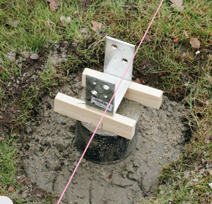 Understøt stolpeskoen med listestykker. Du kan justere skoens højde fra 0 til 50 mm ved at ændre listetykkelsen. Snoren hjælper med at holde linjen med de øvrige stolpesko.