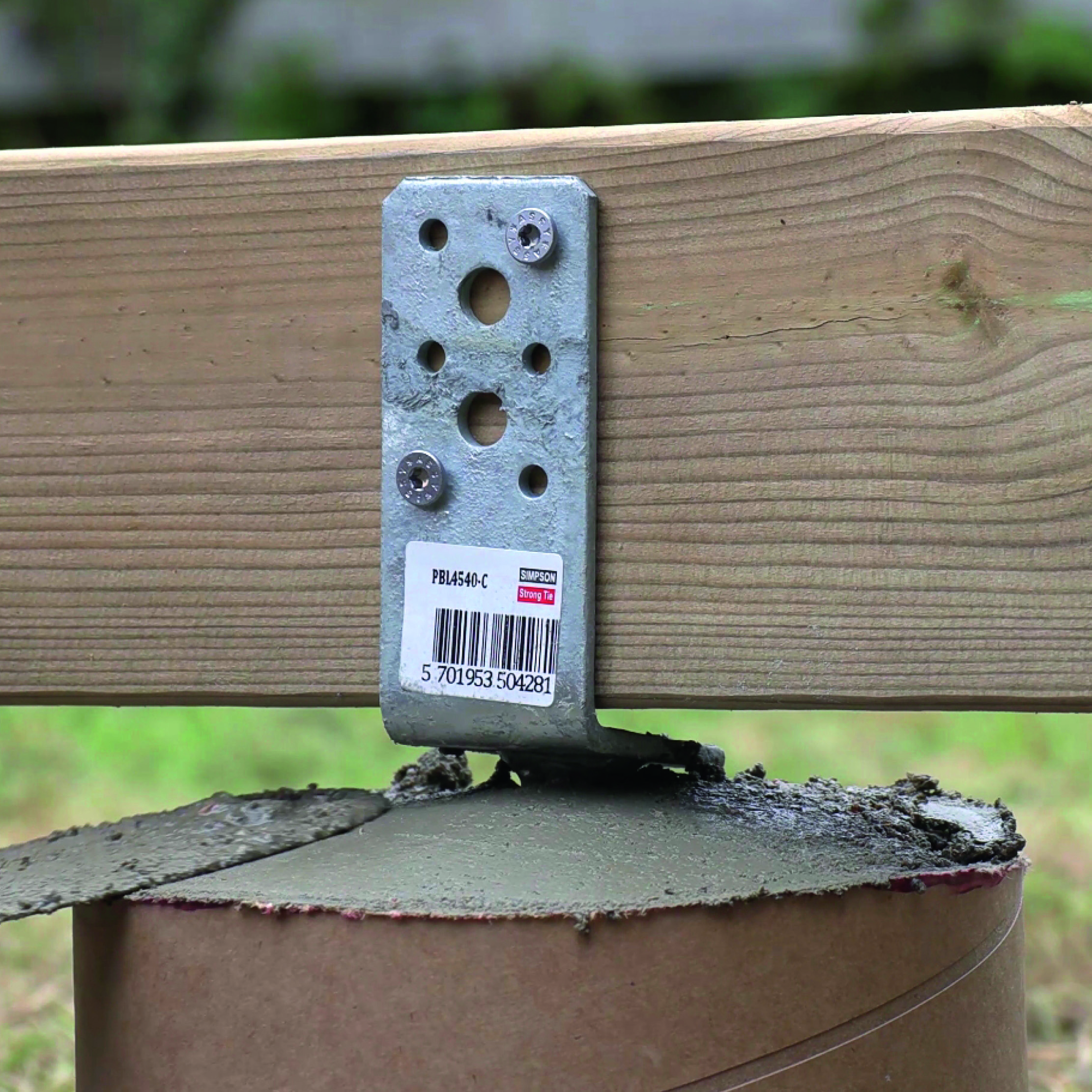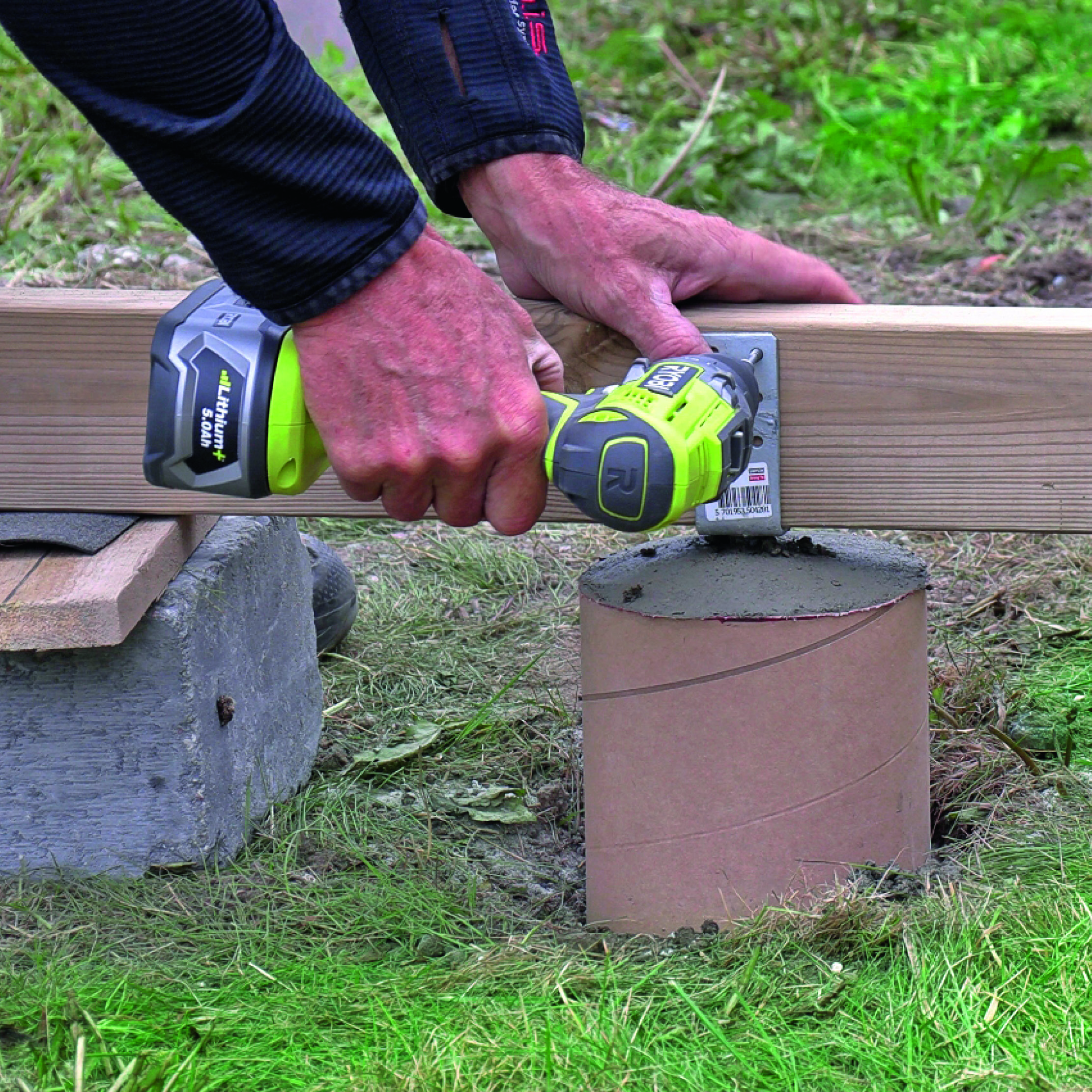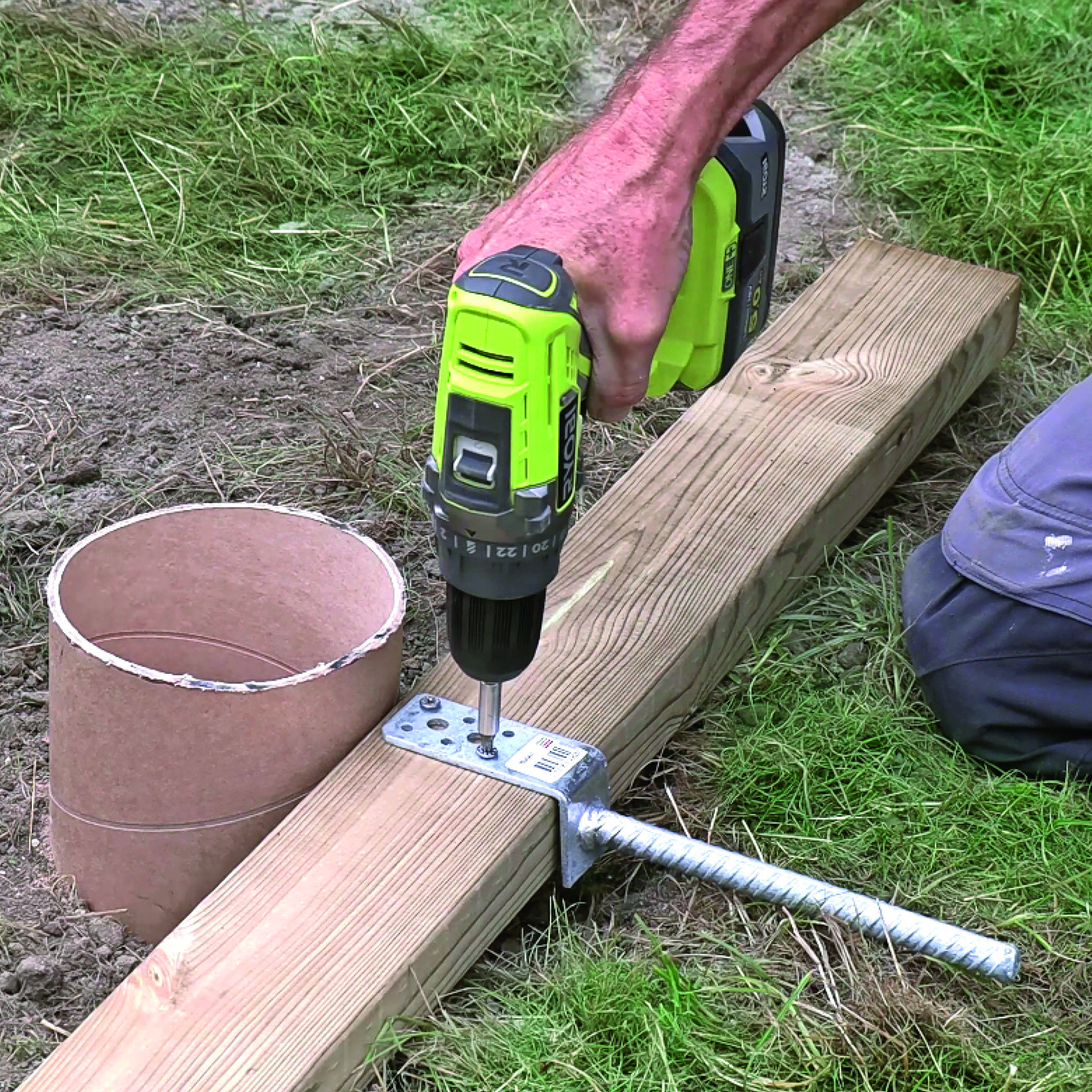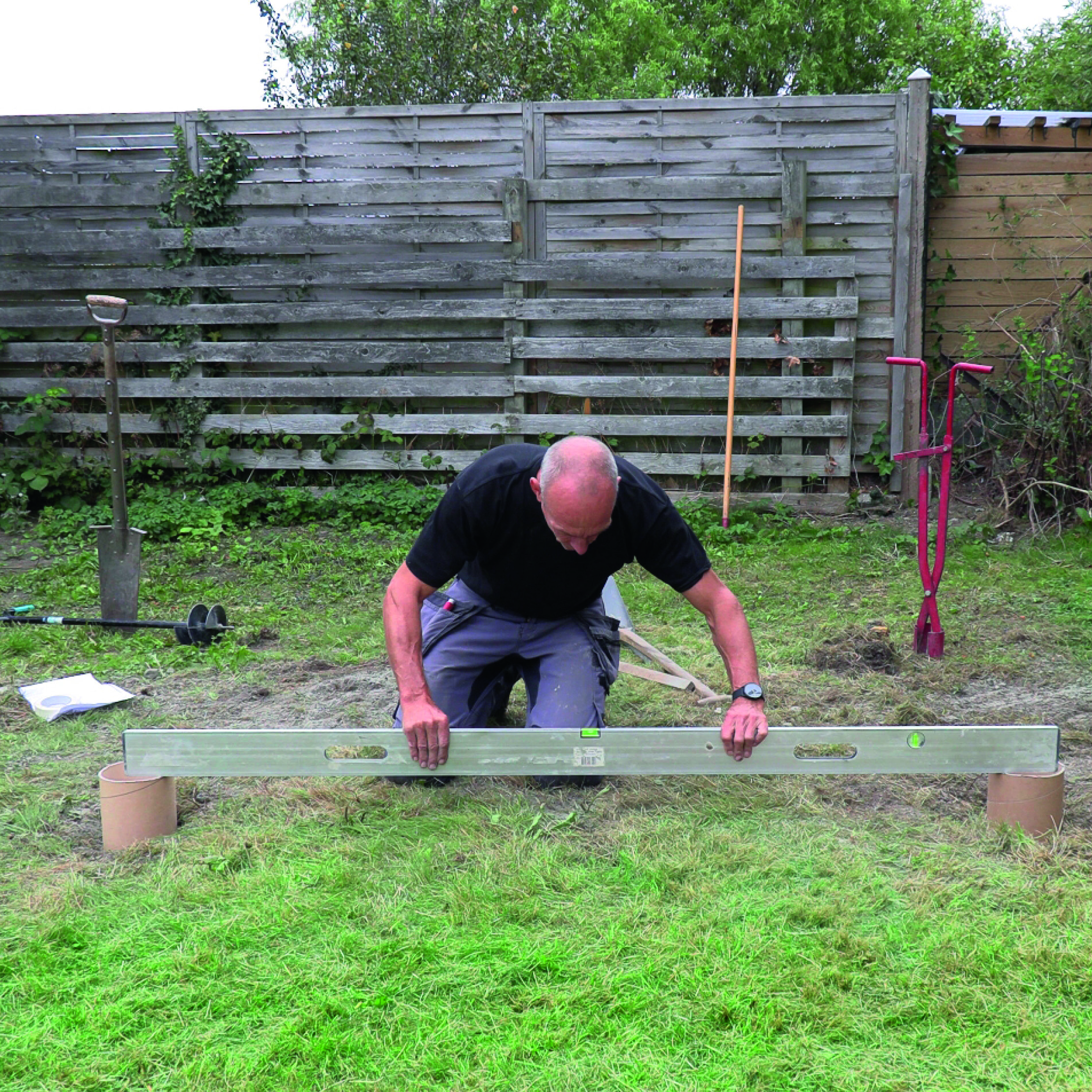 Når du har fyldt paprørene med beton, klodses reglaren med de to stolpesko op, så den øverste del af dem hænger og svæver, mens betonen hærder. Til sidst skrues reglaren af, og så har du to stolpesko, som står på lige linje.