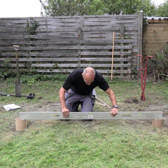 Tjek med et langt vaterpas, om de to paprør er i vater. Inden du kommer så langt, skal du dog grave ud, hælde grus i hullerne og trykke rørene godt fast.