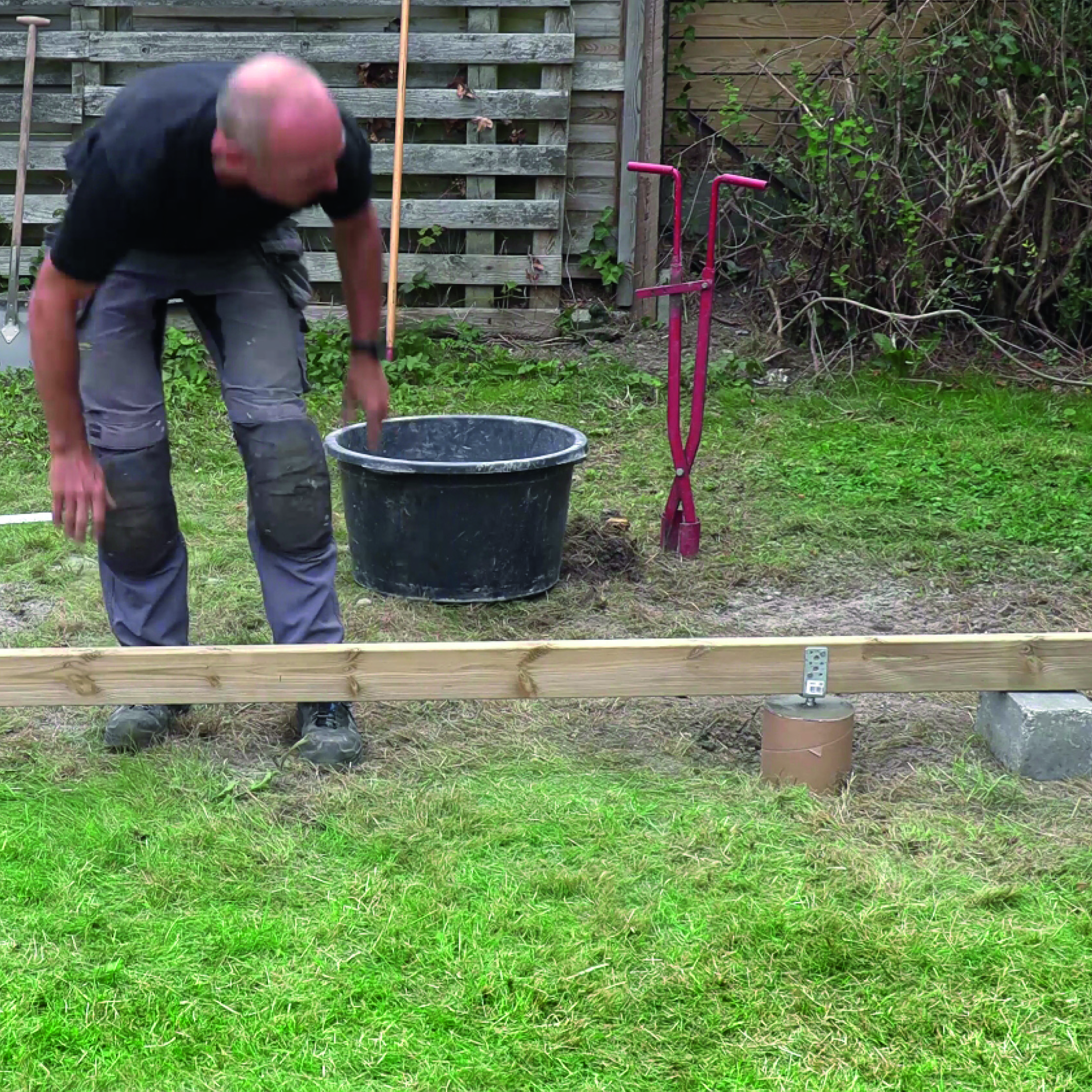 Næste dag er du klar til at støbe stolpeskoene i beton. Vi viser her, hvordan du støber stolpeskoene, så de er helt i vater.