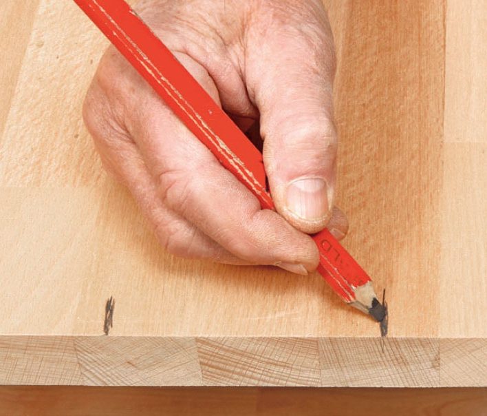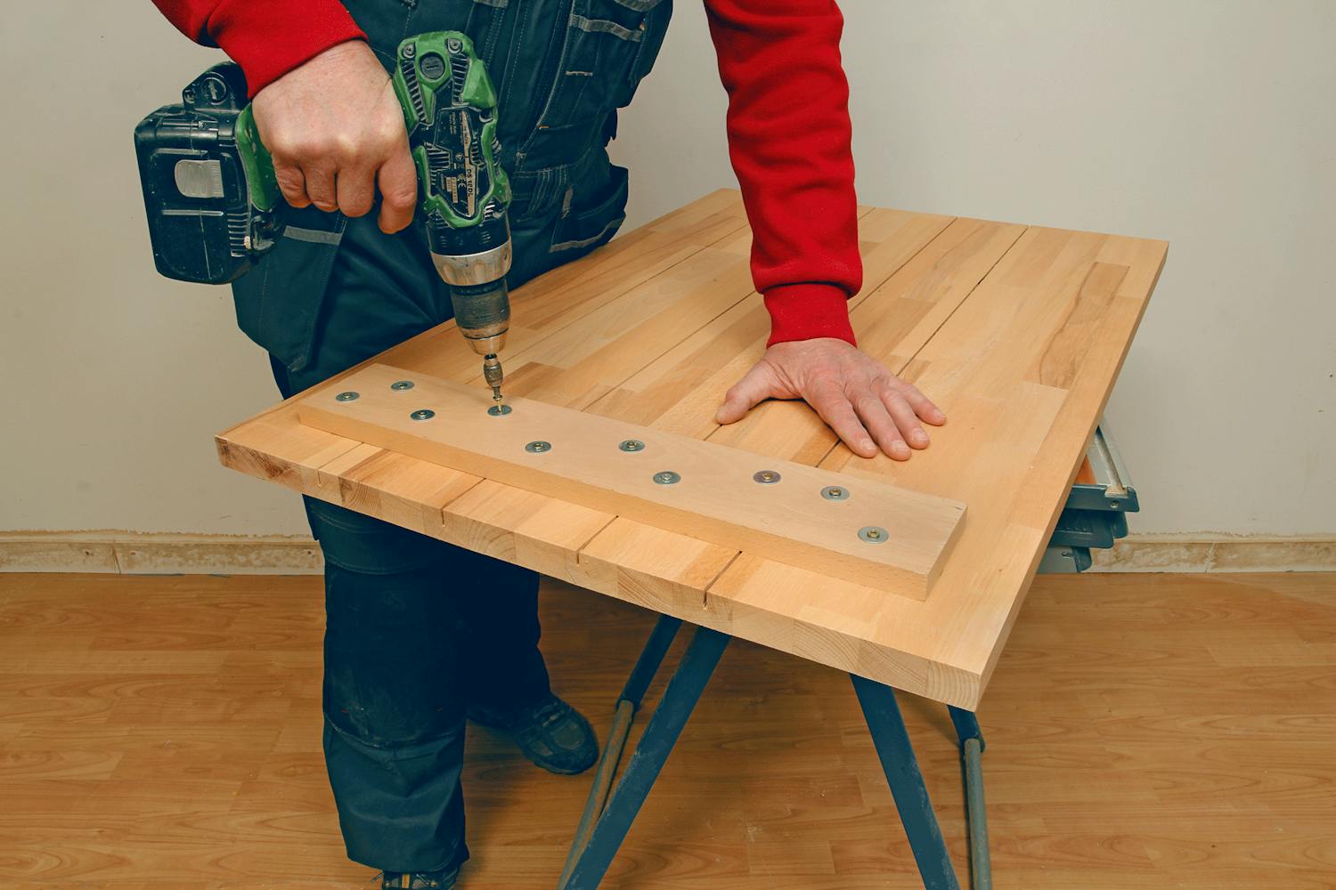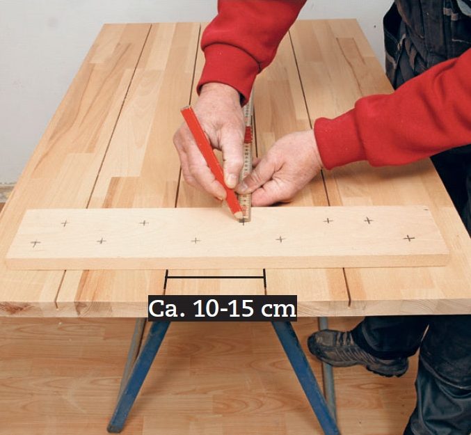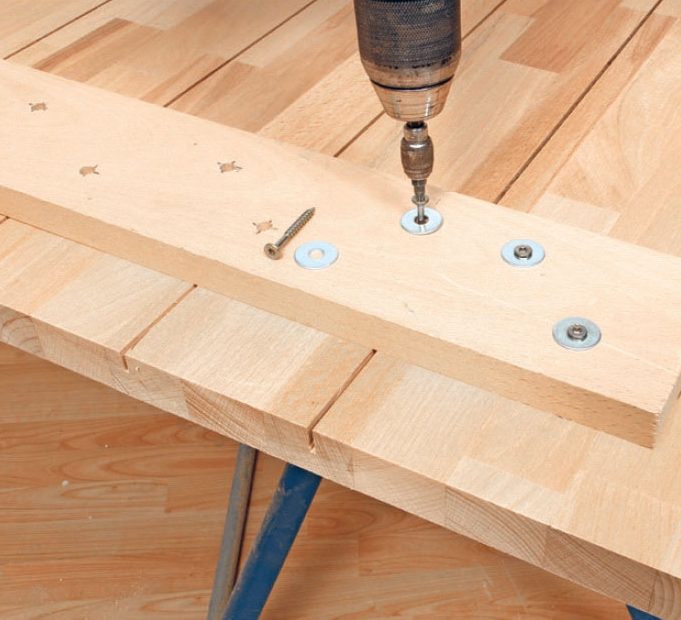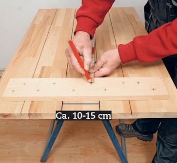 Læg en revle (et tværgående bræt) op på pladen. Mærk op til skruerne. Hold nogle millimeters afstand til samlingerne mellem stavene i bordpladen, og hold cirka 3 cm’s afstand til kanten af revlen.