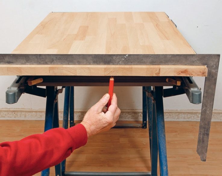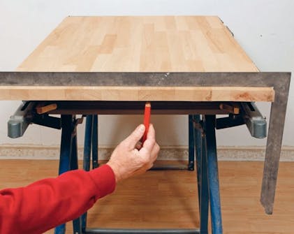 Hvor buer pladen mest op eller ned? Læg en helt lige skinne eller en lang tømmervinkel på tværs på pladens overside, og marker buen med streger på pladens underside.