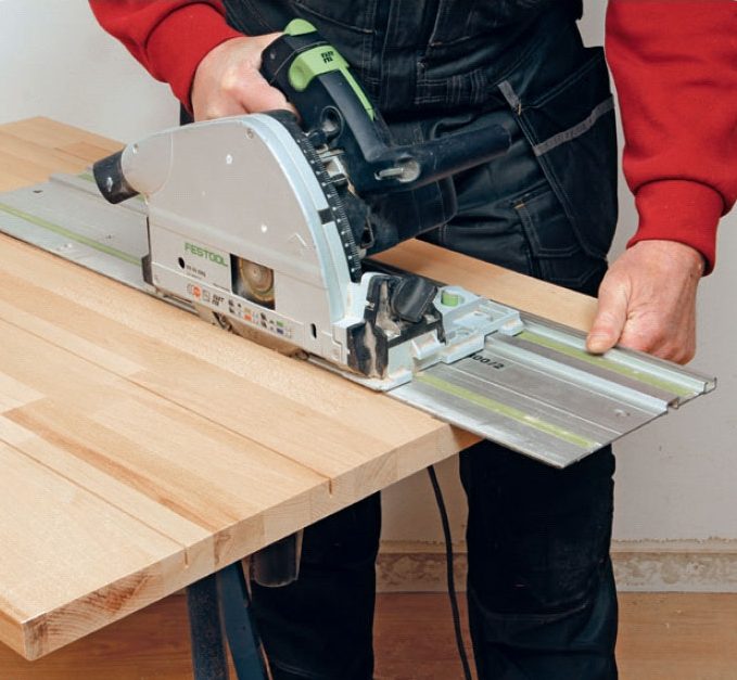 Skær efter stregerne. Rundsavens klinge er stillet, så den går halvvejs ned i pladen. Rundsaven skal styres med en skinne som her eller langs et lige bræt.