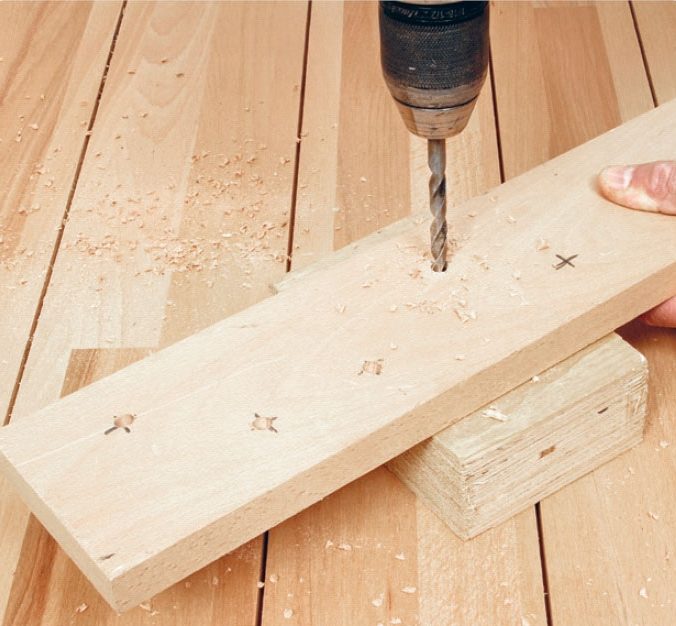 Bor for til skruerne. Træpladen skal kunne arbejde, så hullerne til 4,5 mm skruerne skal bores med et 8 mm bor.