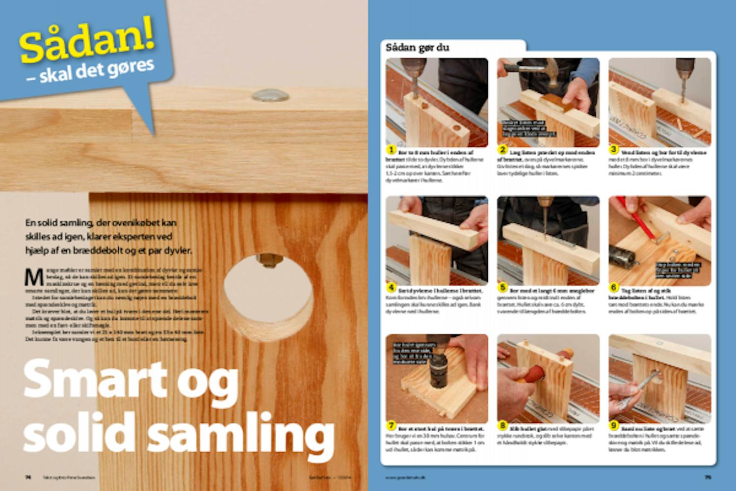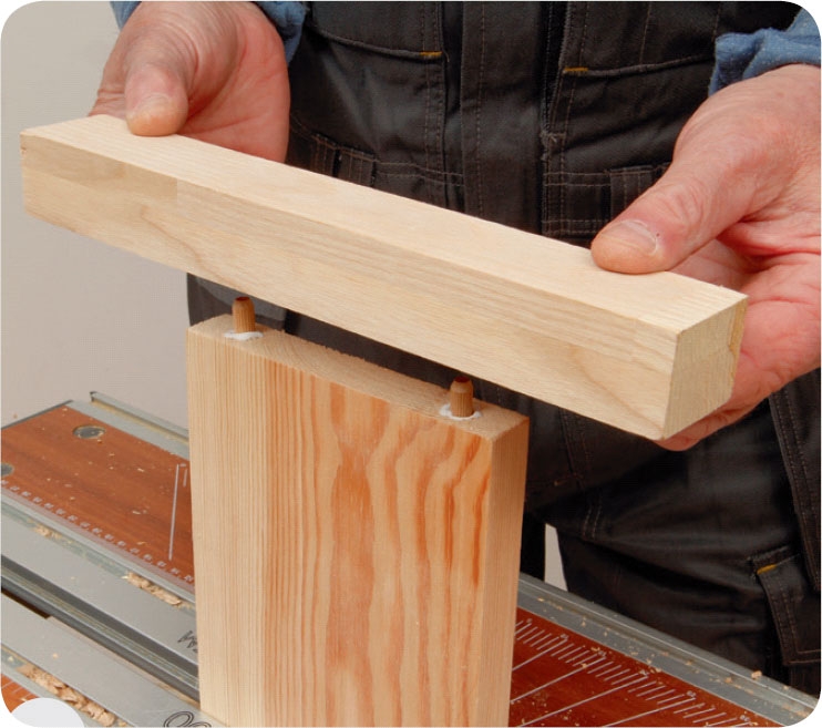 Sæt dyvlerne i hullerne i brættet. Kom forinden lim i hullerne - også selvom samlingen skal kunne skilles ad igen. Bank dyvlerne ned i hullerne.