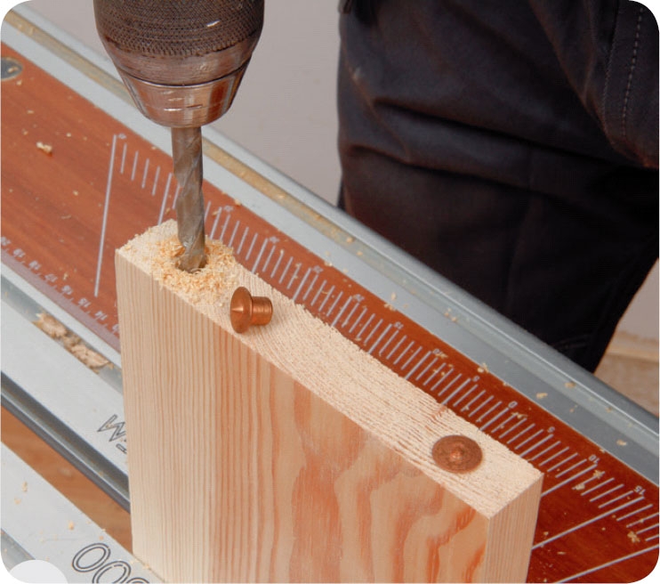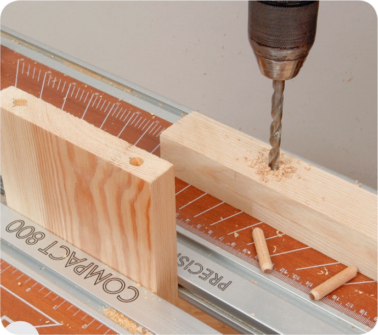 Bor to 8 mm huller i enden af brættet til de to dyvler. Dybden af hullerne skal passe med, at dyvlerne stikker 1,5-2 cm op over kanten. Sæt herefter dyvelmarkører i hullerne.