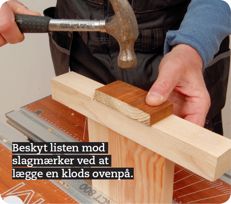 Læg listen præcist op mod enden af brættet, oven på dyvelmarkørerne. Giv listen et slag, så markørernes spidser laver tydelige huller i listen.