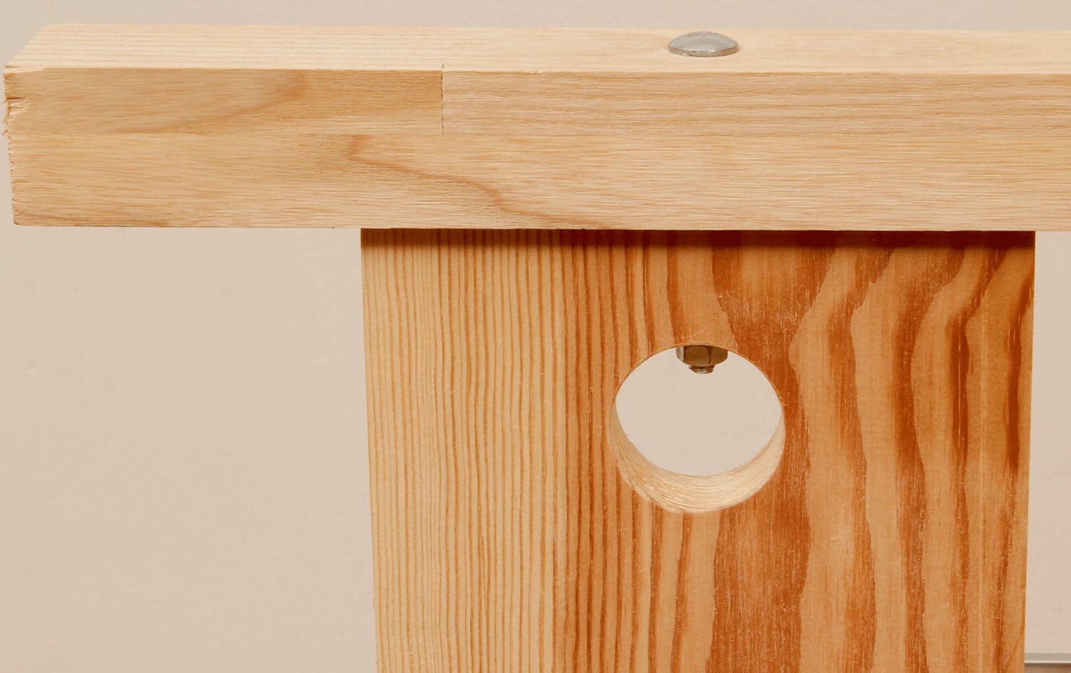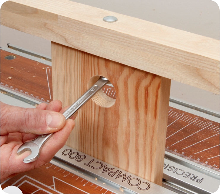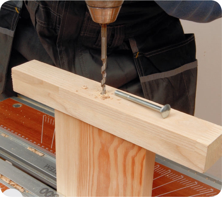 Bor med et langt 6 mm sneglebor gennem listen og midt ind i enden af brættet. Hullet skal være ca. 6 cm dybt, svarende til længden af bræddebolten.