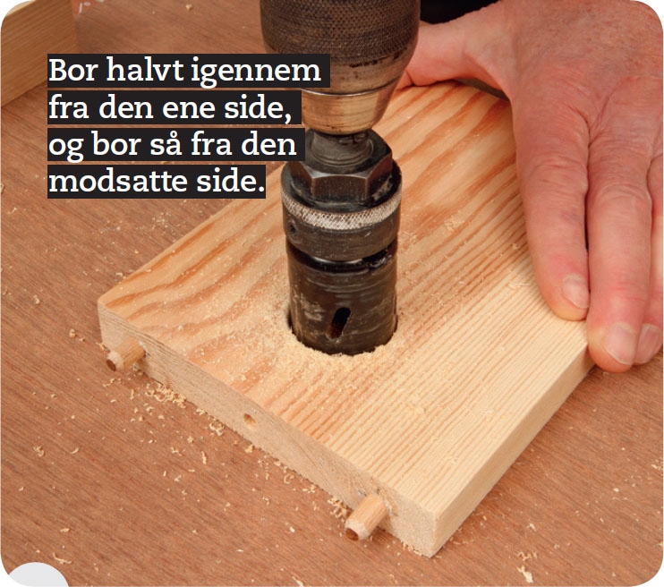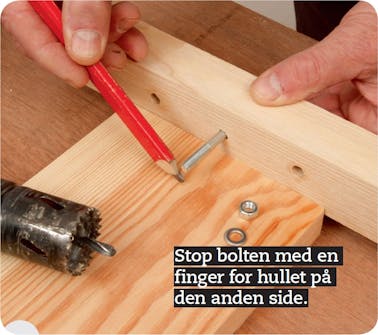 Bor et stort hul på tværs i brættet. Her bruger vi en 38 mm hulsav. Centrum for hullet skal passe med, at bolten stikker 1 cm ud i hullet, så der kan komme møtrik på.