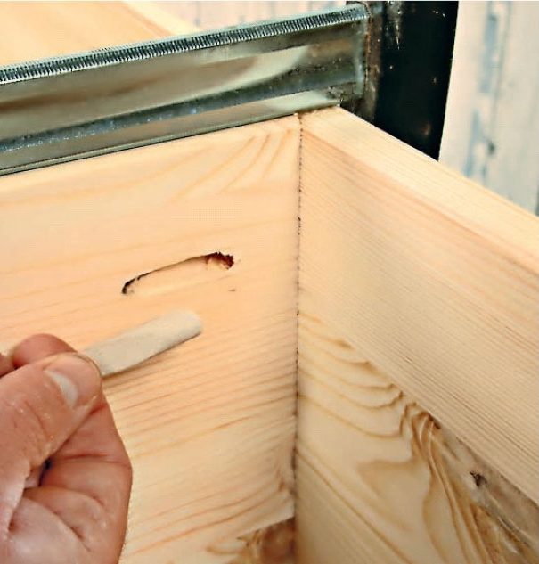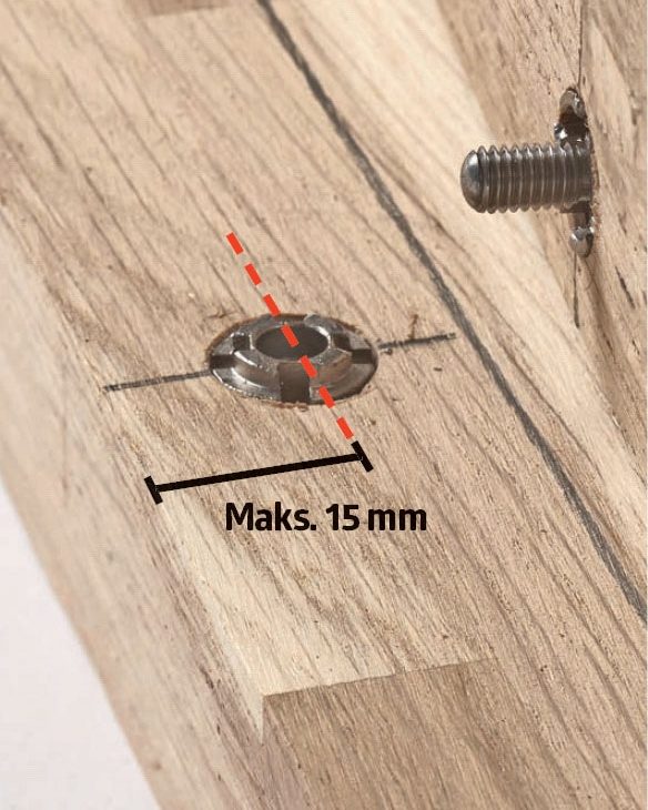 Her vises princippet for placeringen af de to bøsninger. Den korte (nederst) bores 15 mm ind i træet, og den lange kræver en huldybde på 37 mm.