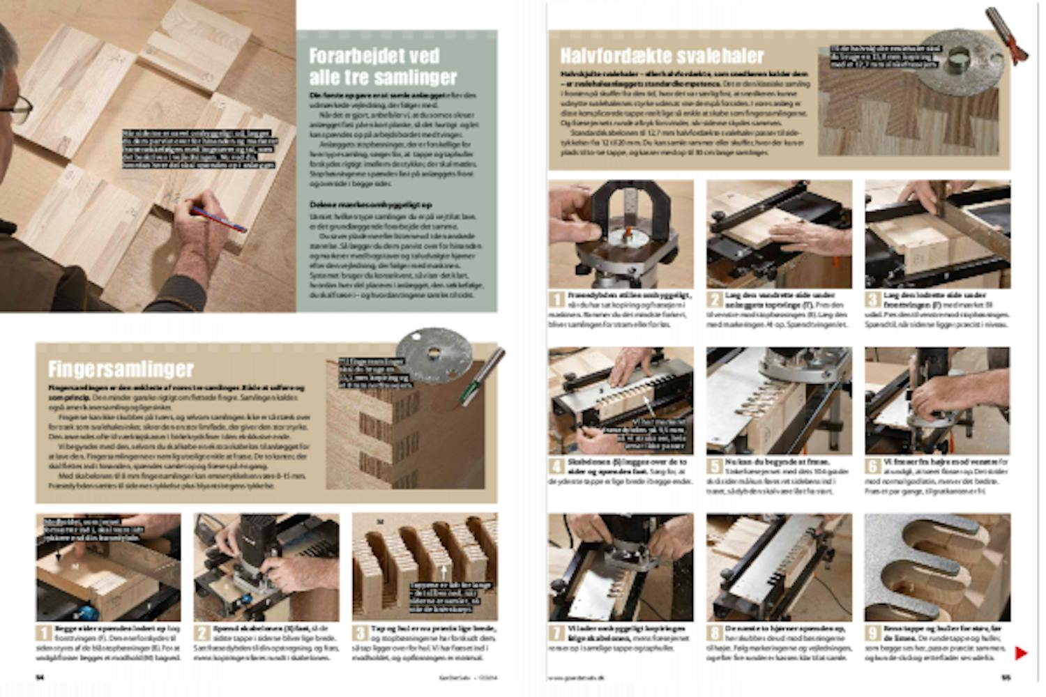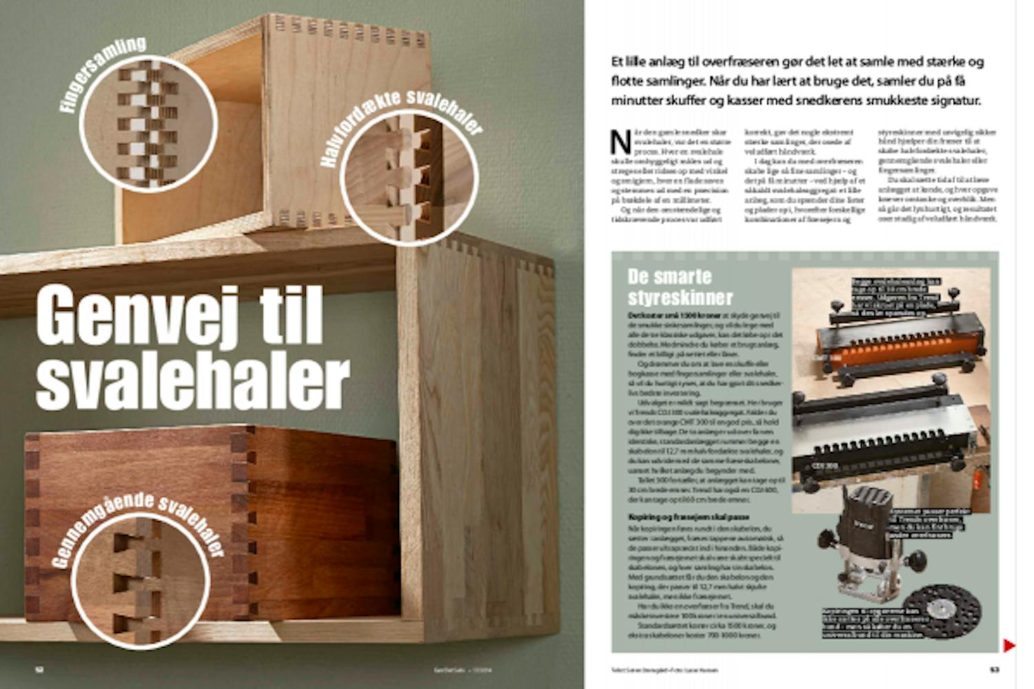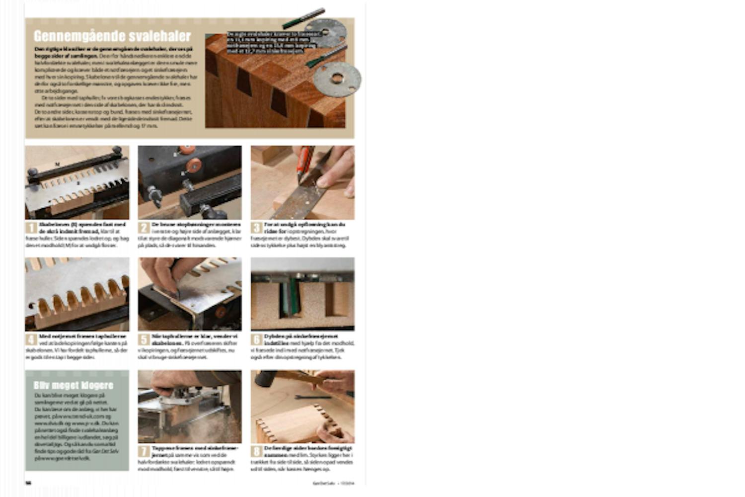 Halvskjulte svalehaler - eller halvfordækte, som snedkeren kalder dem - er svalehaleanlæggets standardkompetence. Det er den klassiske samling i fronten på skuffer fra den tid, hvor det var særlig fint, at snedkeren kunne udnytte svalehalernes styrke uden at vise dem på forsiden. I vores anlæg er disse komplicerede tappe reelt lige så enkle at skabe som fingersamlingerne. Og fræsejernets runde aftryk forsvinder, når siderne skydes sammen.