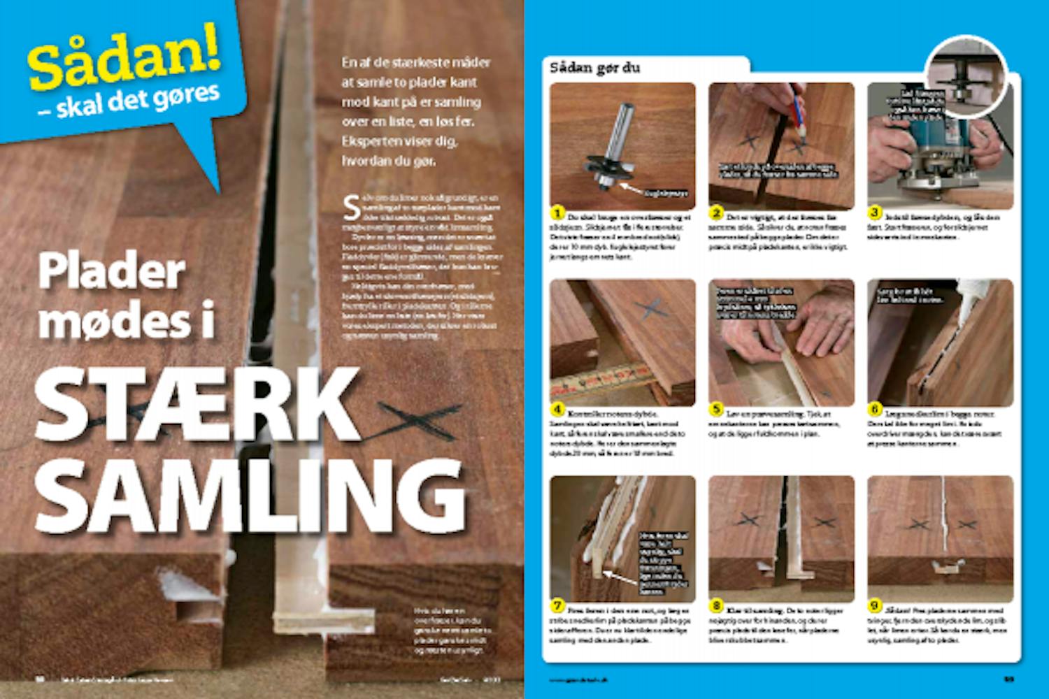 Du skal bruge en overfræser og et slidsjern. Slidsjernet fås i flere størrelser. Det viste fræser en 4 mm bred not (slids), der er 10 mm dyb. Kuglelejestyret fører jernet langs emnets kant.
