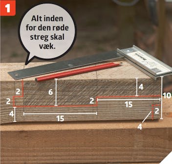 Skær nu ud i enden af tømmeret. Vend tømmeret med bagsiden opad, og streg et felt på 2 x 4,2 cm op i hver side. Streg også 4 cm ned langs ydersiden. Brug multicutte-ren til at fjerne de to klodser.