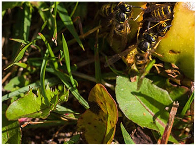 Sidst på sæsonen er hvepse på udkig efter sukker. Og hvor der ligger råddent frugter på græsplænen, er der helt sikkert også hvepse. Husk handsker, når du fjerner frugten!