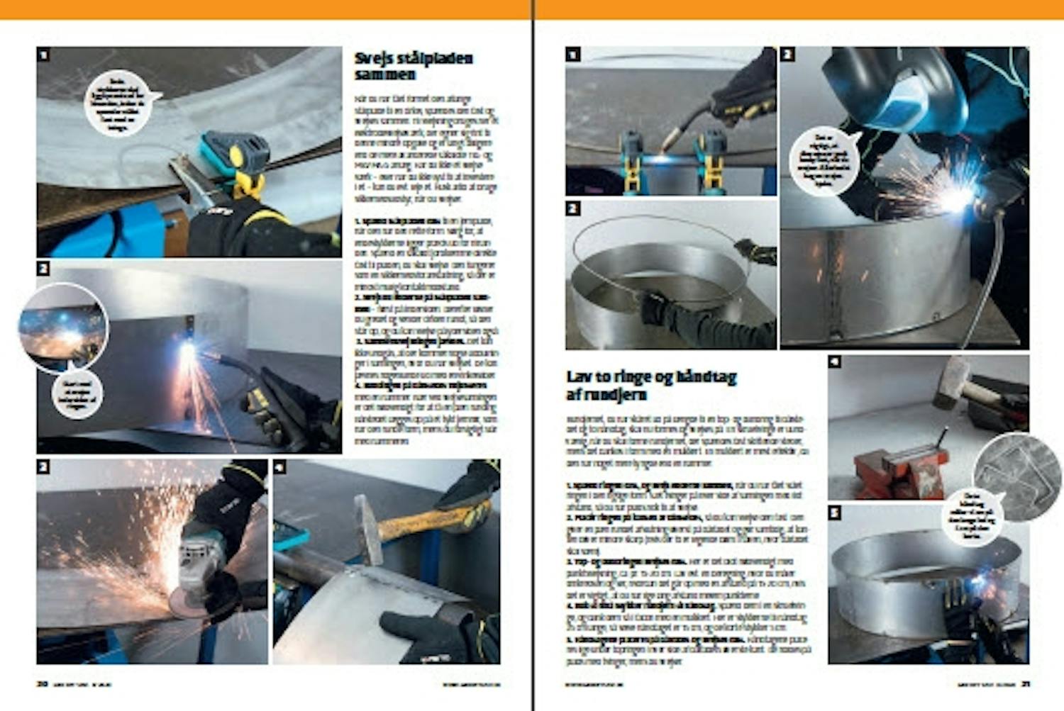 Når du har fået formet den aflange stålplade til en cirkel, spændes den fast og svejses sammen. Til svejsning bruges her et elektrodesvejseværk, der egner sig fint til denne mindre opgave og er langt billigere end de mere avancerede såkaldte TIG- og MIG/MAG-anlæg. Har du ikke et svejseværk - eller har du ikke lyst til at investere i et - kan du evt. leje et. Husk altid at bruge sikkerhedsudstyr, når du svejser.