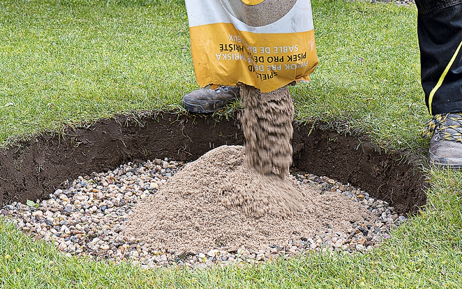 Fordel underlaget af sten og grus. I bunden lægges her småsten, ca. 15 cm. Stabilgrus kan også bruges. Ovenpå et lag afretningsgrus på ca. 3 cm.