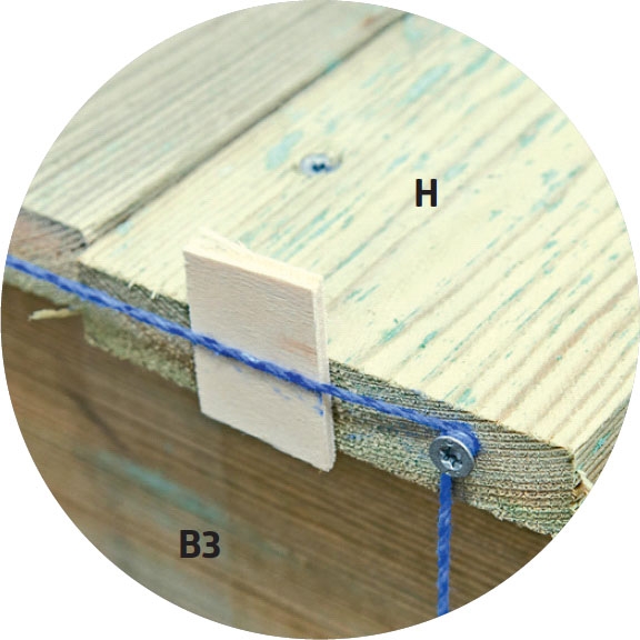 Det yderste bræt i hver ende af platformen skrues fast med 4 x 40 mm klimabestandige skruer. Spænd en snor ud mellem dem, som du kan rette ind efter.
