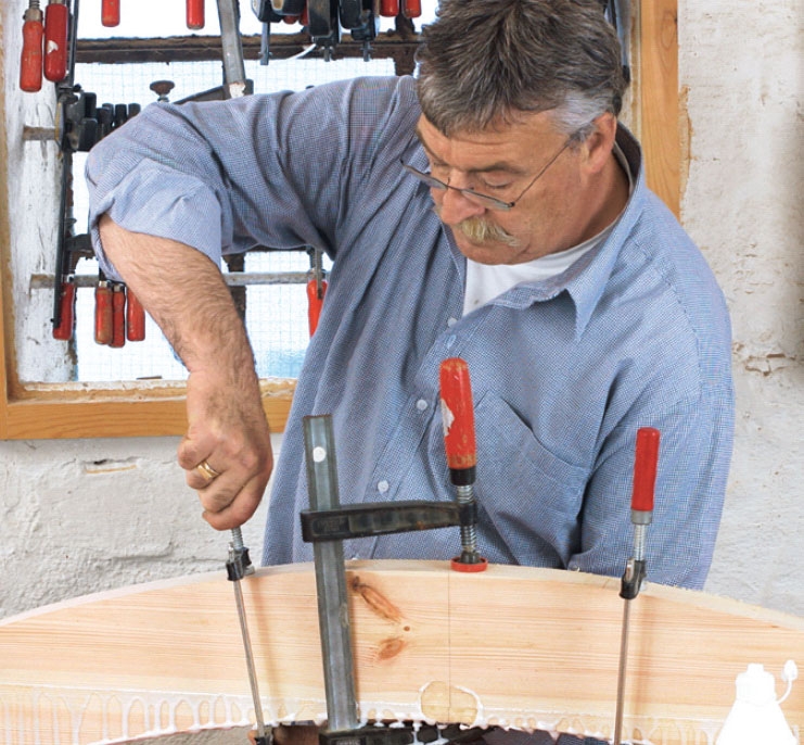 Når det gælder materialer og værktøj, skal du kun bruge en stiksav og to ret-skårne, lige planker af 45 x 150 mm lærketræ - 160 cm lange. Krumningen af plankerne foretages i tre nemme trin.