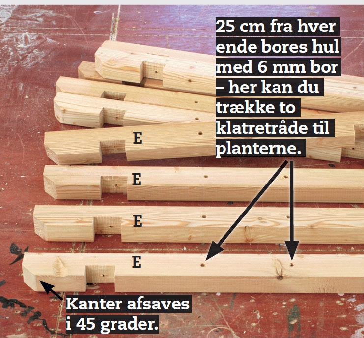 Brug en rundsav eller bord rundsav til at save brædderne ud med. 10 cm fra tremmernes ender skal der saves og udstemmes et hak, så tremmerne kan komme ned over overliggerne. Lav hakkene 2 cm dybe og 4,5 cm brede. Derefter skal der bores to huller i hver tremme. Igennem hullerne skal der løbe klatretråd, så planterne siden hen har noget at gribe fat i.