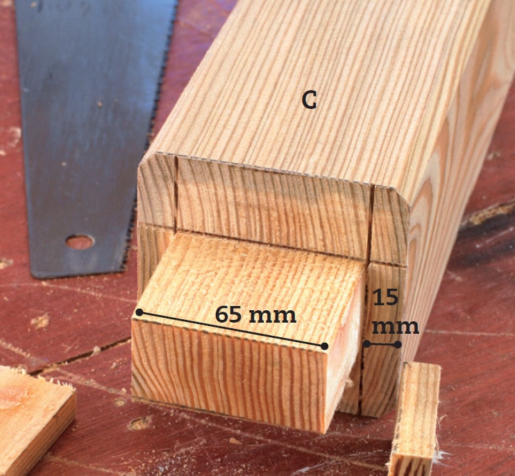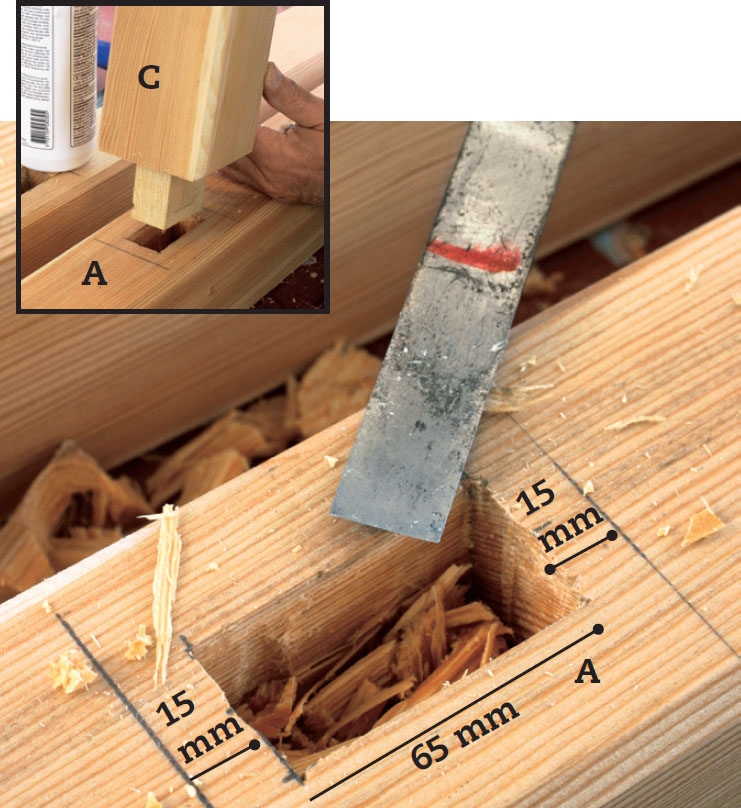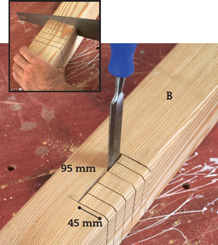 Sav 5-6 spor ud til de 9 cm brede hak. Hakkene skal sidde 10 cm fra hver ende og sørger for, at tværstiveren kan gribe ned over stolpens top (A). Sav først de to yderste spor, så du har styr på hakkets bredde. Stem ud med stemmejernet.