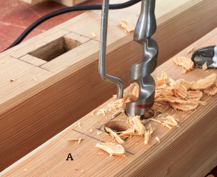 Efter forboring udstemmes taphullet. Lav ikke hullet for stort, men stem i små bidder. Dernæst fastgøres løsholten i begge stolpesider med pu-lim. En 6 x 120 mm skrue ind i tappens endetræ giver ekstra styrke.