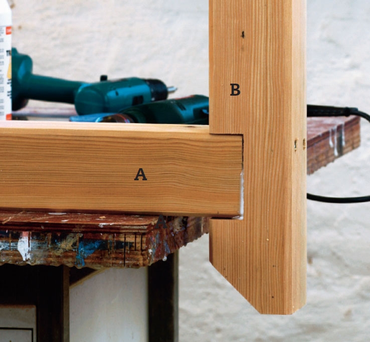 Stolperne (A), der danner portalens forside og bagside, bindes sammen i toppen af to tværstivere (B), som vi skal lave af 90 x 90 mm lærkestolpe. De skæres på samme måde som de tremmer, vi netop har monteret på den krumme overligger - altså med hak og afskårne hjørner på underkanten.