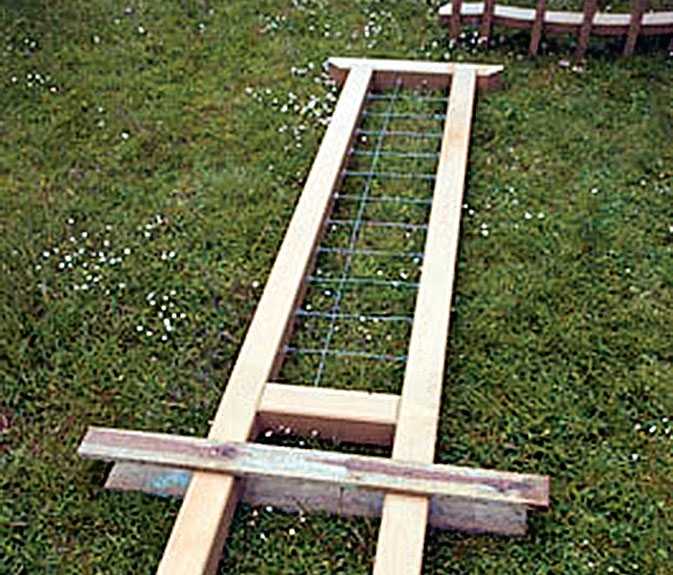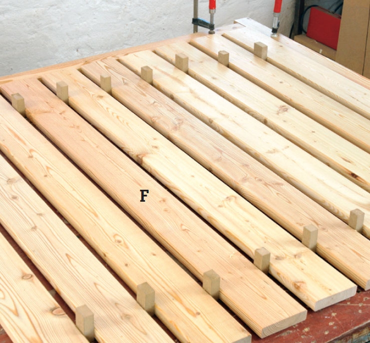 Lærkebrædderne (F) udsaves i længden 110 cm. Med små listestykker som afstandsklodser lægges brædderne op til en bredde på 118 cm.