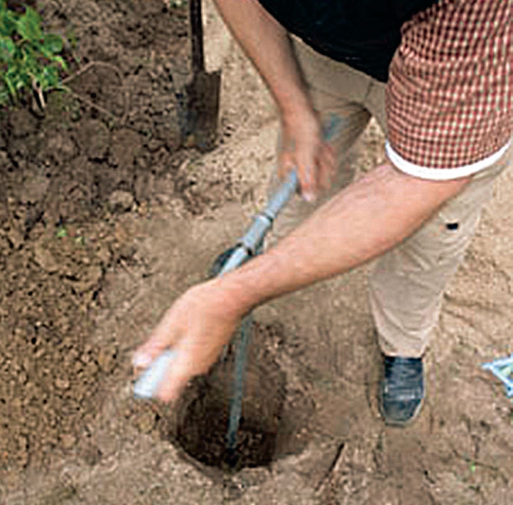 Så skal der graves. Hullet skal være mindst 90 cm dybt. Hullet skal være ca. tre gange så stort som stolpen, så du får plads til at stampe jorden, når du lukker hullet igen. Sørg for at stampe jorden for hver 10 cm jord, du fylder i hullet.
