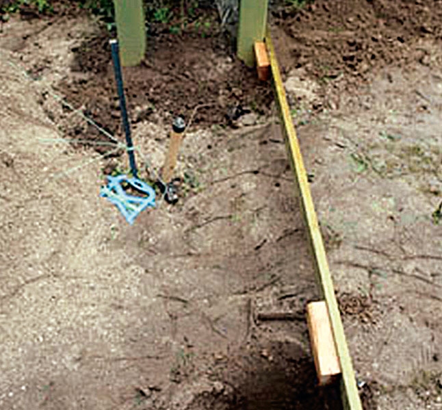 Den ene side af portalen er klar til montering. Et par brædder placeres midlertidigt 20 cm under løsholten (C) - som et slags “dybdestop”. Ved nedgravning skal underkanten af disse brædder nemlig være i niveau med jordoverfladen.