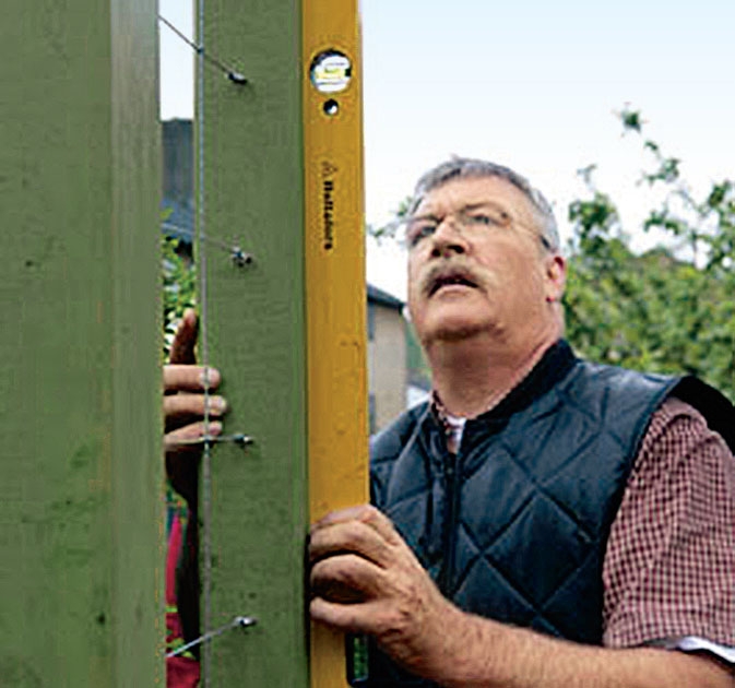 På hver side spændes galvaniseret ståltråd op til klatreplanterne.