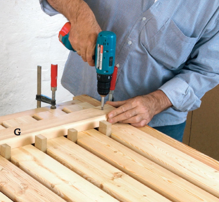 Skru de to løsholter (G) midlertidigt fast i lågens to yderste brædder. Men lad være med at skrue løsholterne fast i alle bræd derne, for der skal måles op og saves ud til et sadelhak.