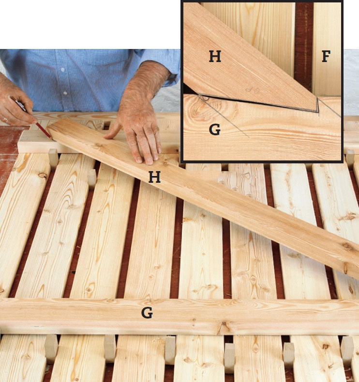 Tegn op og sav ud til sadelhak. Læg skråstiveren (H) op på løsholterne (G). Spidsen af skråstiveren skal stikke 1 cm ned i løsholterne ud for inderkanten af lågens yderste brædder. Tegn hakket op på løsholterne, og sav det ud.