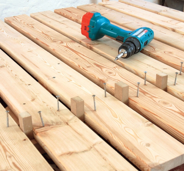 Skru hele lågen sammen. Vend lågen om, så du kan arbejde fra forsiden. Alle brædderne skrues fast til løsholter og skråstiver med 4 x 40 mm skruer.