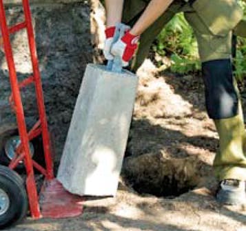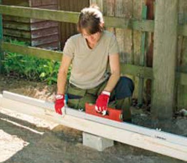 Fundamentblokkene rettes til, så de står helt på linje og omtrent i samme højde. De sidste millimeter i højden kan du justere, når stolperne skrues fast, så der er grænser for, hvor meget du behøver at slås med de tunge blokke.