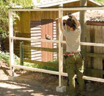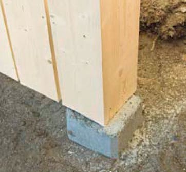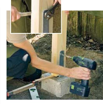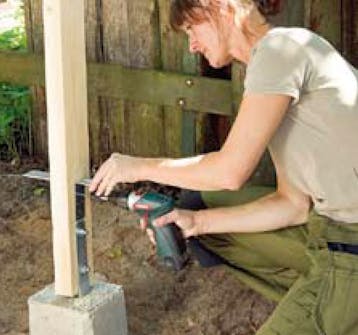 Stolperne skrues fast på deres fundamenter med gennemgående bolte. Få hjælp til at holde stolpen lodret, mens du borer for med et 10 mm træbor. Stolpen stilles imens på et par led i tomme stokken, så den løftes fri af regnvandet.