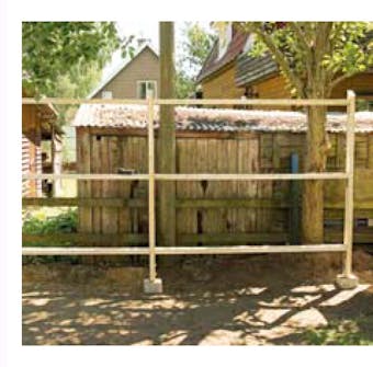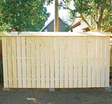 Står plankeværket udsat for blæst, styrkes det ekstra med vinkelbeslag på oversiden af samlingerne og eventuelt skråstivere. Her op ad naboens hegn og skur er der tilstrækkelig styrke til den korte flade i de valgte stolpesko.