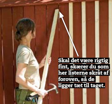 På grund af den skrå afdækning må listerne skæres en smule kortere end brædderne, ellers rager de nedenfor - taget er jo lavere, hvor de stødes op.