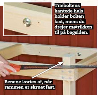 Vinkeljernene til de vandrette bjælker i skelettet skrues fast med beslagskruer. I den lodrette flig sætter du skruer helt ind til knækket, på den vandrette flig dropper du de yderste huller for ikke at flække bjælken i enden.