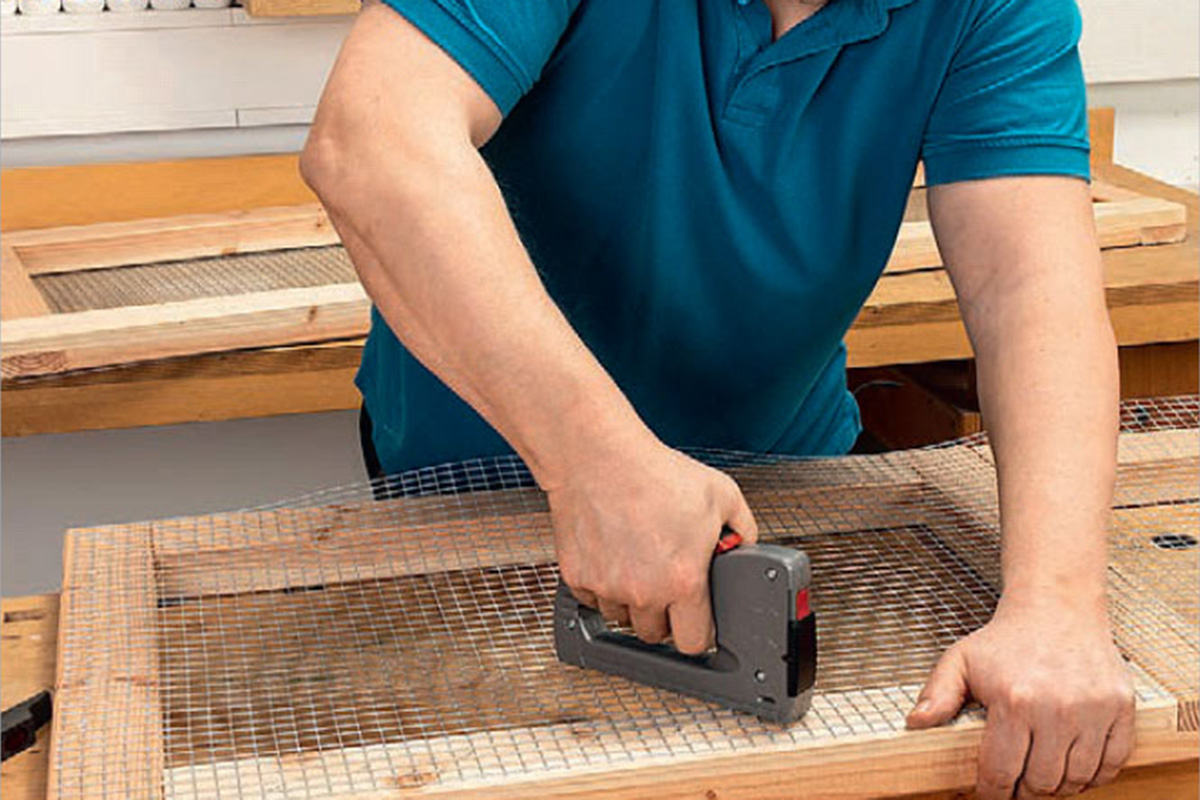 Volierenettet sættes fast med klammer. Du kan selv vælge, om du skyder klammerne fast med en klammepistol eller sømmer dem i. Klammerne skal være mindst lige så tykke som nettet.