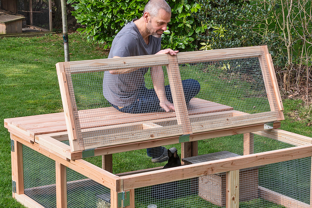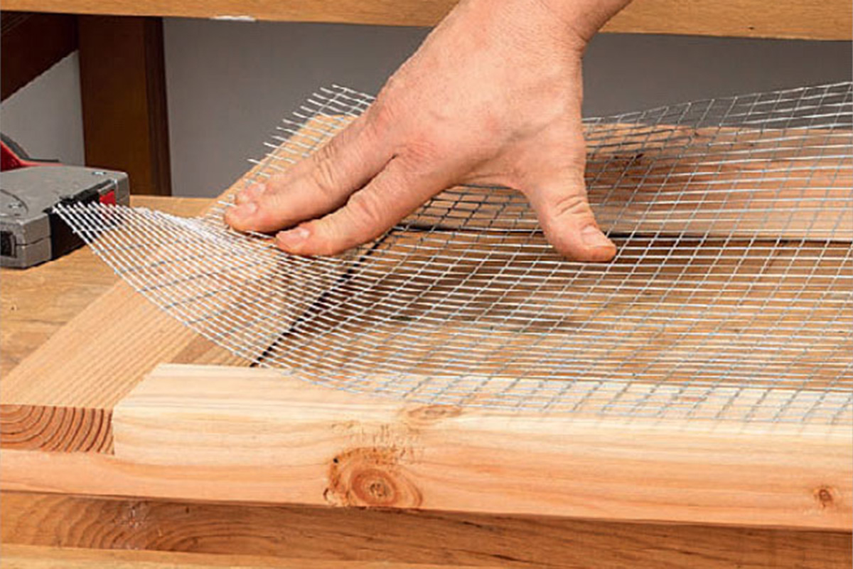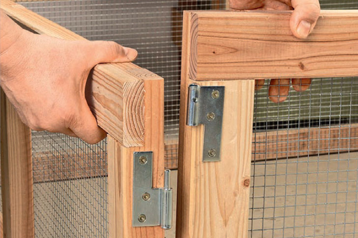 Rammerne alene holder ikke en kanin inde. Derfor skal seks ud af syv rammer (fire siderammer og to toprammer) beklædes fra indersiden med volierenet. Nettet klippes til med en skævbider, så det passer til rammens dimensioner, og hæftes fast med store klammer.