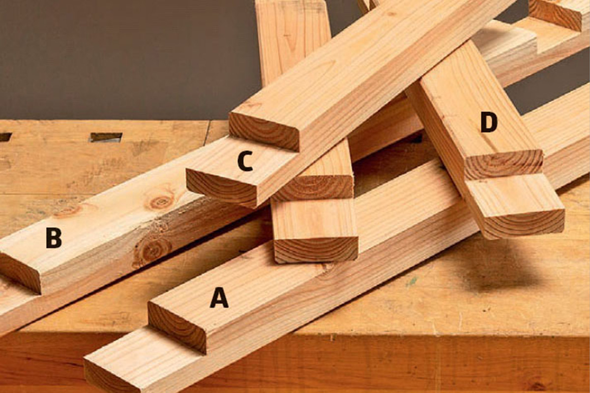 Kaninburet består af syv individuelle rammer, som hver især er samlet af fem stykker spærtræ. Det første skridt i projektet er at klargøre de 35 sideog toprammestykker, du skal bruge. Stykkerne skæres ud af 45 x 70 mm høvlet spærtræ. De fire siderammer er lige store og lavet af ens stykker (A og B). De tre toprammer er en my større og lavet af ens stykker (C og D).