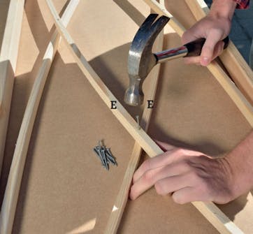 Søm de 9 bundbrædder (D) fast oven på støttelisterne (E). De fordeles jævnt, så afstandene er nogenlunde ens.
