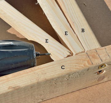 Rammedelene (B og C) spændes op på en plade med vinkelrette hjørner; så har du fuldstændig styr på dem, mens de skrues sammen. Det er en stor fordel, når du skal til at sætte de buede lister i spænd.